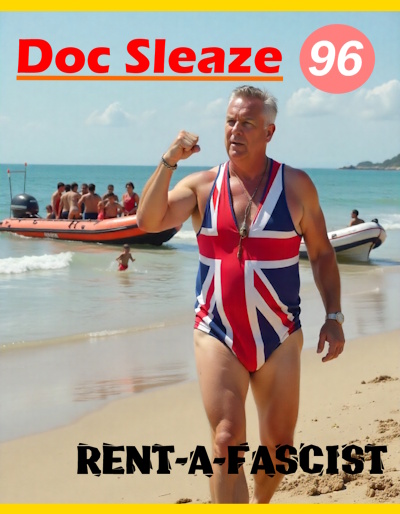 46:47 – Doc Sleaze muses on the virtues of being a nobody, before proving that the supposedly unspeakable is, indeed, speakable. Also, the re-emergence of fascism on the streets of Britain is put into context as Doc Sleaze takes a stand against the new generation of ‘rent-a-fascist’ mobs. Plus, we hear from top influencer Kirk Kevorkian, get advice on stench packing and drop in on ‘Action Business News’ as they discuss the stench of Trump and much more. Includes: