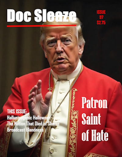 46:47 – Doc Sleaze muses on the virtues of being a nobody, before proving that the supposedly unspeakable is, indeed, speakable. Also, the re-emergence of fascism on the streets of Britain is put into context as Doc Sleaze takes a stand against the new generation of ‘rent-a-fascist’ mobs. Plus, we hear from top influencer Kirk Kevorkian, get advice on stench packing and drop in on ‘Action Business News’ as they discuss the stench of Trump and much more. Includes: